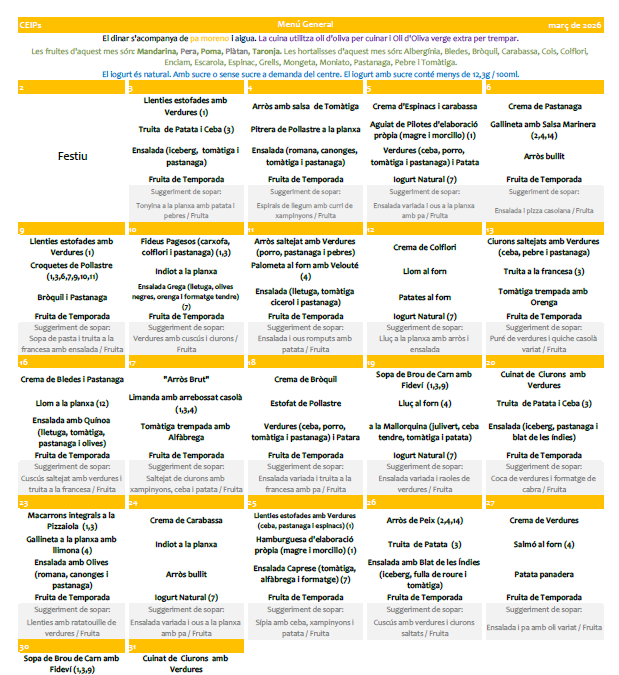 Com cada mes, l’equip de cuina ha preparat un menú equilibrat, saludable i pensat perquè els nostres alumnes tinguin tota l’energia necessària per aprendre i jugar. Continuem apostant per productes de temporada i receptes variades per garantir una bona alimentació.